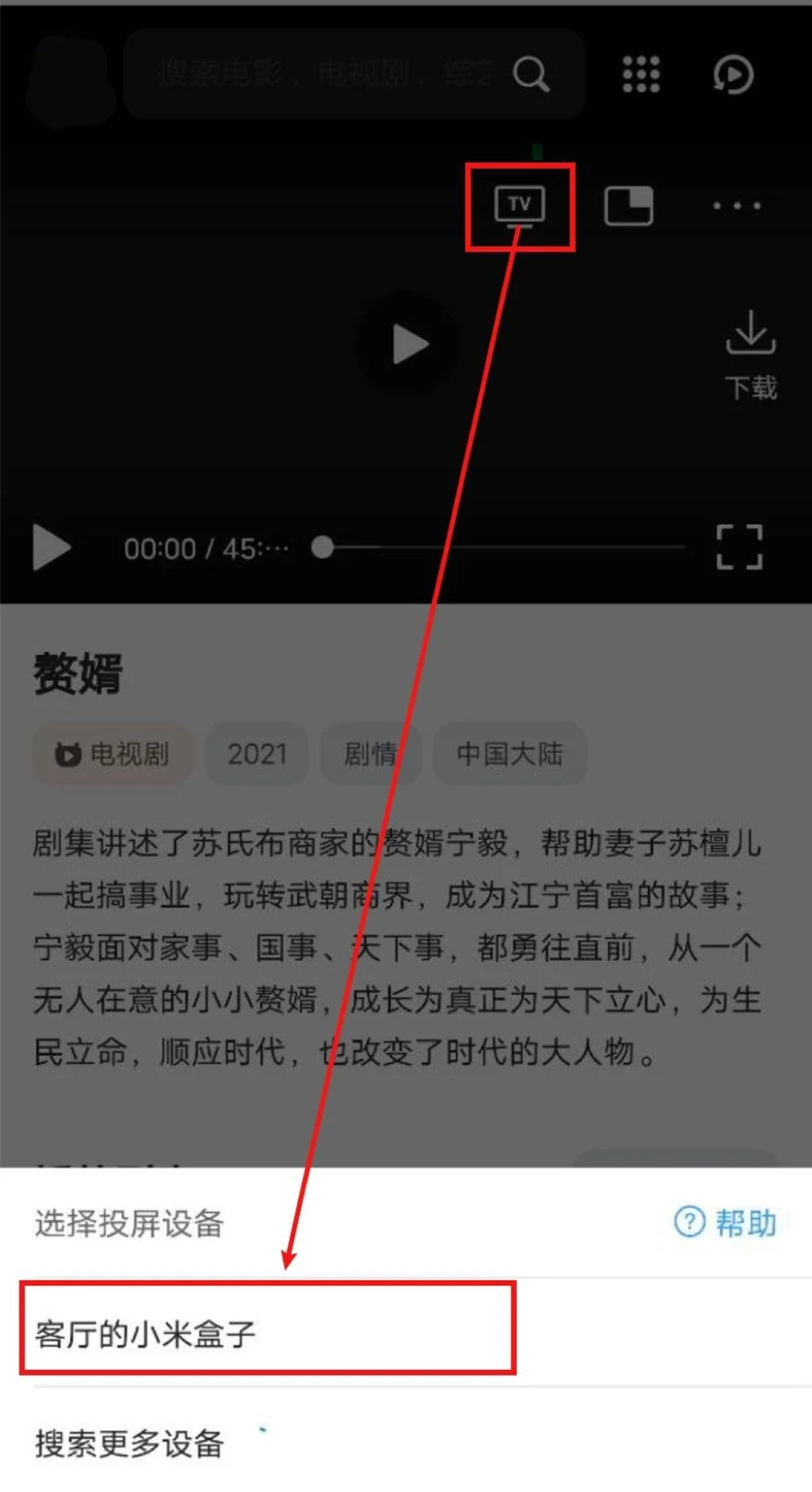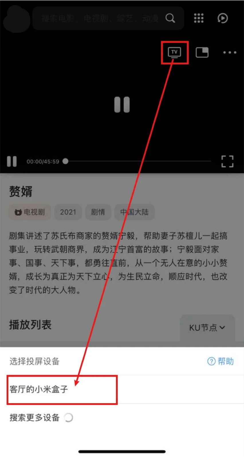 打开QQ浏览器(会接管网页播放器)->打开aojieの影视破站->播放视频->选中投屏图标->等待搜寻出智能电视/电视盒子->选中,即可投屏。